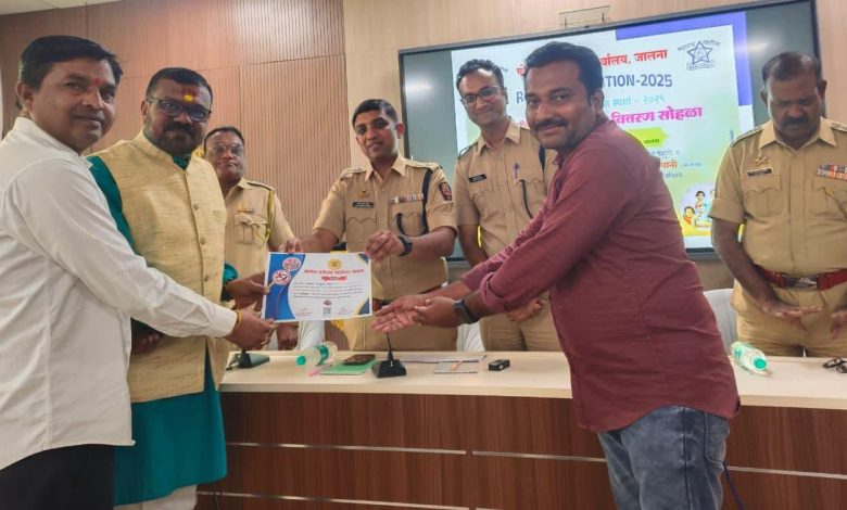 जालना जिल्हा पोलीस विभागाच्या वतीनी ’अमली पदार्थ व त्याचे दुष्परिणाम आणि महिला सुरक्षा आणि सशक्तीकरण ‘ दोन विषयांवर महाराष्ट्र स्तरीय रिल्स कॉम्पिटिशन २०२५ चे आयोजन करण्यात आले होते.या स्पर्धेत रवी लोखंडे लिखिती,दिग्दर्शित व अभिनित रिल्स सादर केली होती.यात जालना जिल्ह्याचे प्रसिद्ध रिल्सस्टार योगेश गोरे(सोनूचे पप्पा),शिवकन्या गोरे(सोनुची मम्मी), गजानन महाले आणि रवी लोखंडे यांनी भूमिका केल्या.या स्पर्धेचा निकाल सोमवार (दि.१५)रोजी पोलीस अधीक्षक कार्यालयाच्या सभागृहात पार पडला.यावेळी पोलीस अधीक्षक अजयकुमार बंसल आणि अपर पोलीस अधीक्षक आयुष नोपानी यांच्या हस्ते या संचाच्या सर्व कलाकारांना सहभागी प्रमाणपत्र देऊन सन्मान करण्यात आला.