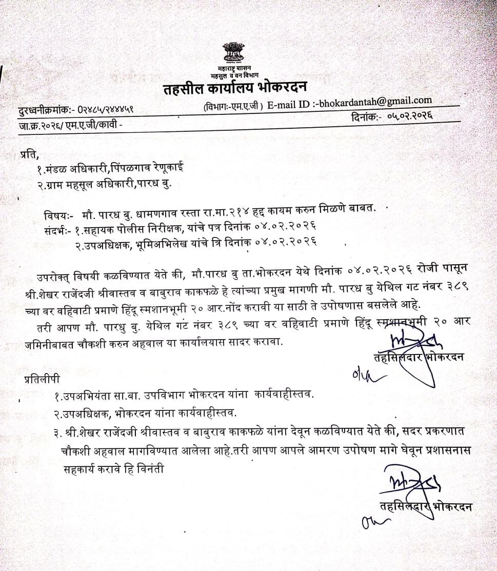 स्मशानभूमीची शासकीय नोंद: पारध बु. येथील गट नंबर ३८९ मधील वहीवाटीप्रमाणे असलेल्या २० आर क्षेत्रावर ‘हिंदू स्मशानभूमी’ म्हणून नोंद करण्यासाठी मंडल अधिकारी आणि ग्राम महसूल अधिकारी यांना तात्काळ चौकशी अहवाल सादर करण्याचे निर्देश दिले आहेत.